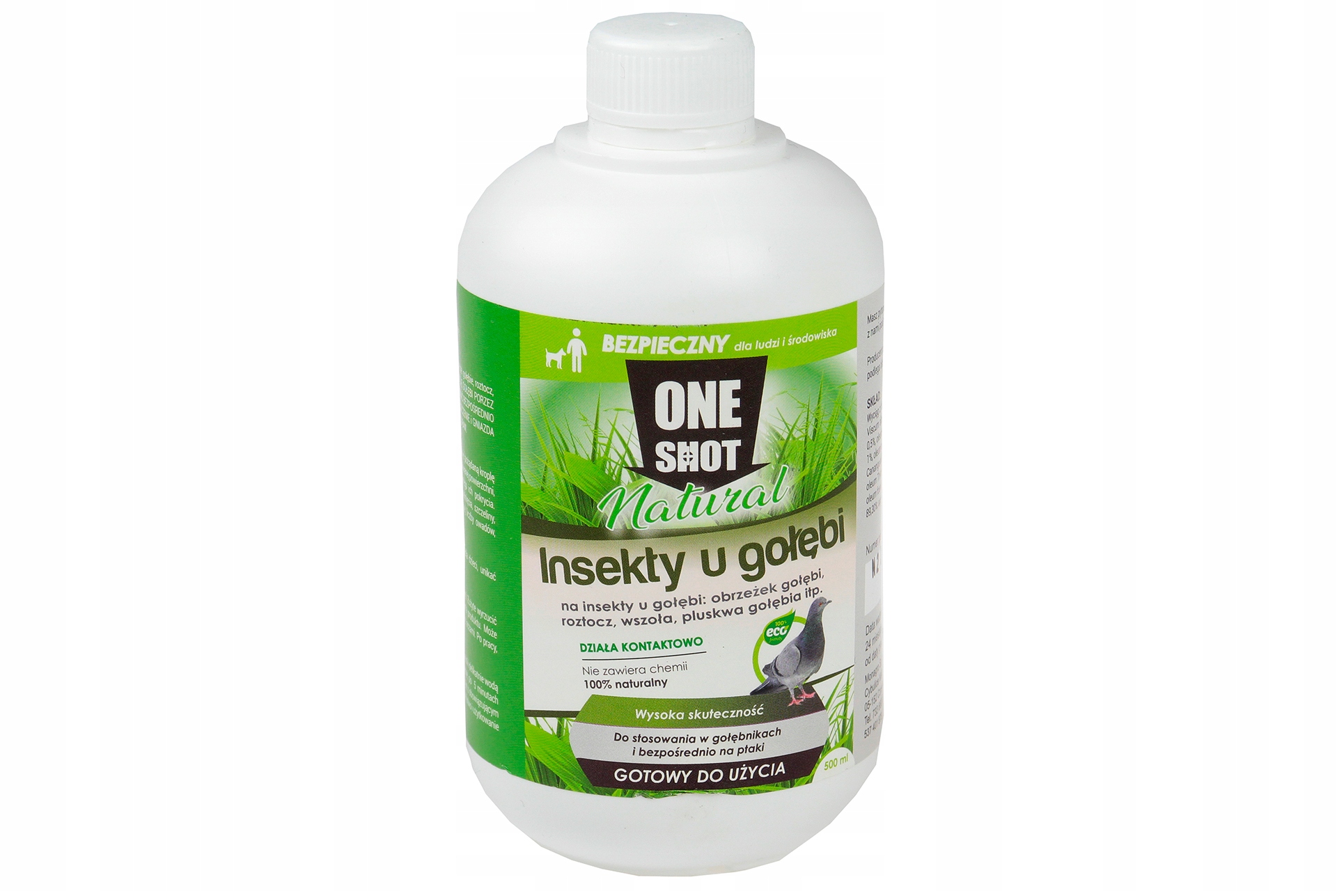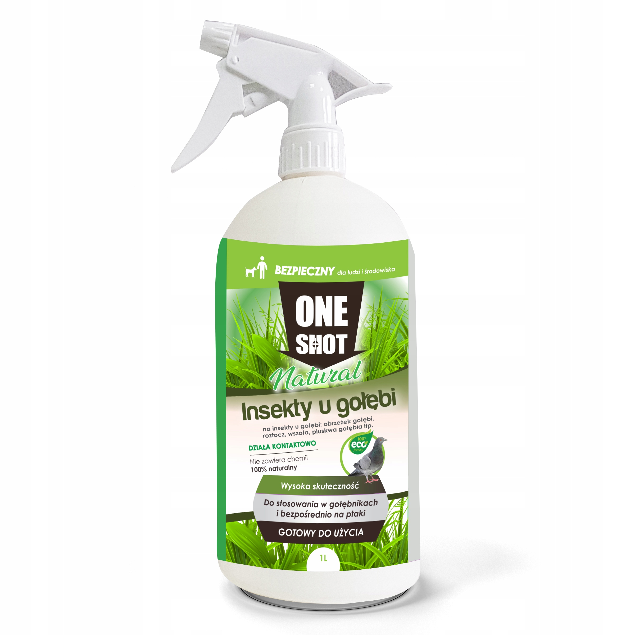 ONE SHOT NATURAL to bardzo mocny, gotowy do użycia, w 100% naturalny preparat zwalczający roztocza piór, wszoły, pchły gołębie, kleszcze gołębie, pluskwy gołębie, obrzeżki i inne. Produkt na bazie naturalnych olejków i wyciągów z roślin. Preparat jest bezpieczny dla ludzi, zwierząt i środowiska. Oprysk o świeżym, cytrynowym zapachu zapewnia 100% skuteczności w walce z owadami. ONE SHOT NATURAL działa kontaktowo.