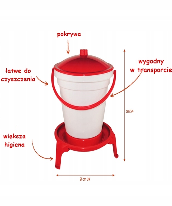 Wygodna rączka pozwala na przenoszenie poidła w dowolne miejsce, nawet w przypadku napełnienia zasobnika. Zasobnik o pojemności 18 litrów przykryty jest dopasowaną pokrywką, którą otwiera się wyłącznie w przypadku dolewania wody. Taka budowa zapobiega dostaniu się do środka zanieczyszczeń.